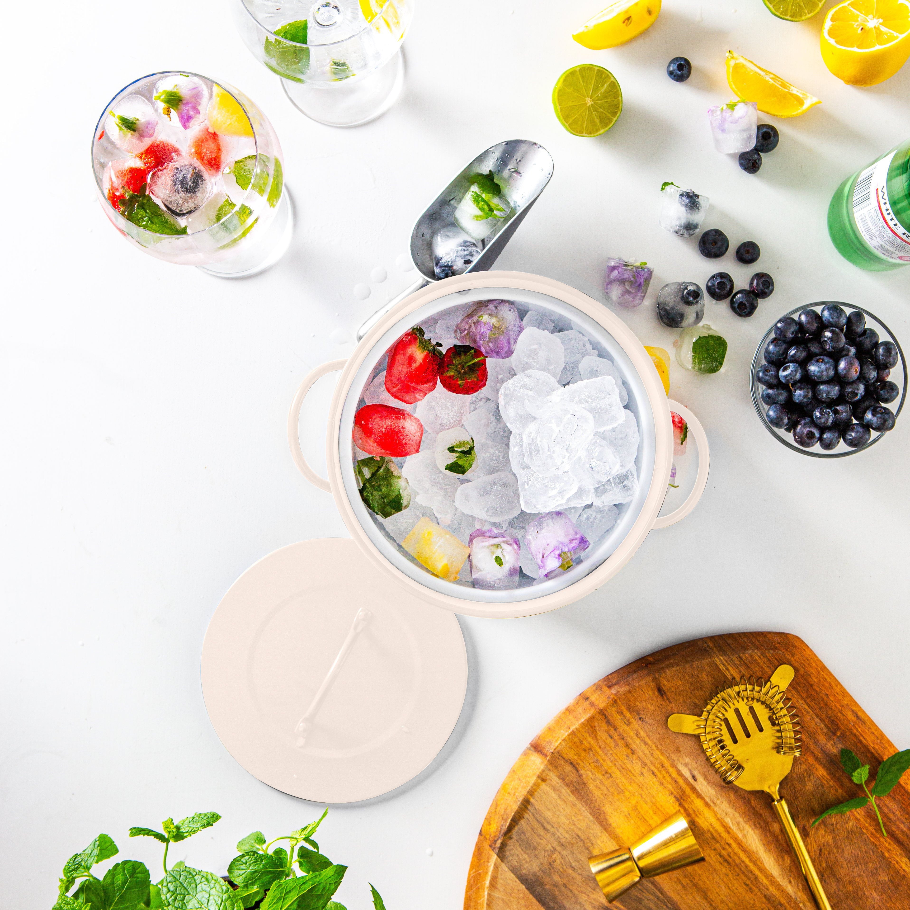 With its distinctive styling and diminutive footprint, this bucket makes a charming centrepiece on any table or countertop, injecting any environment with an immediate air of retro industrial chic. The two-piece design - a plastic inner contained inside the powder-coated steel outer - traps a layer of cold air, helping to keep contents colder for longer.