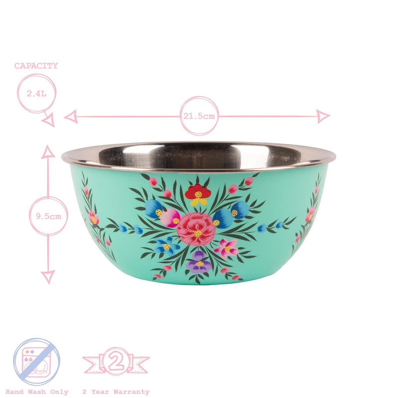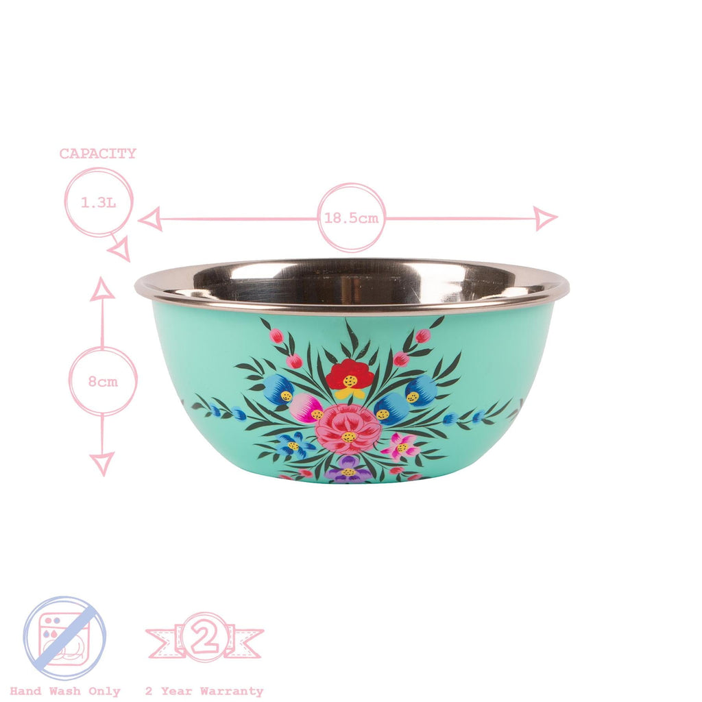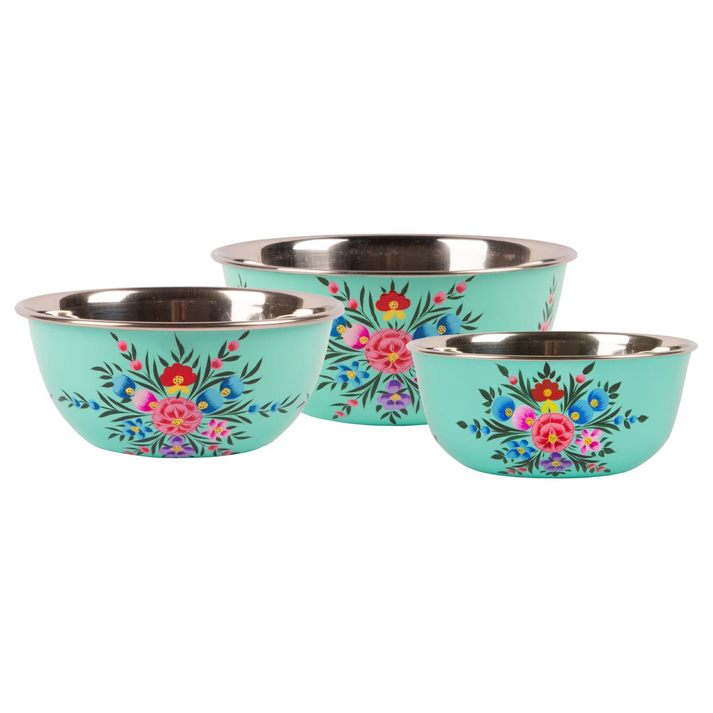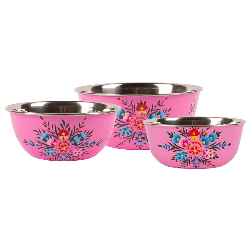 The elegant floral motif has been hand-painted by a collective of traditional artists from the Kashmir region of India, giving each piece an individual flavour and its own unique story to tell. The three different bowl sizes stack neatly inside one another for convenient, space-saving transportation and storage.