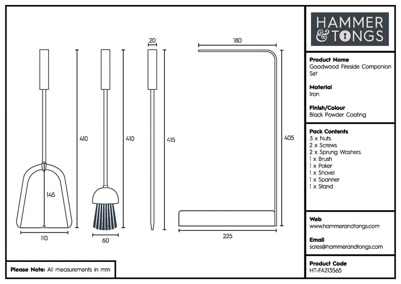 Keep the home fires burning and fireplaces clean and tidy with this 4-piece Goodwood Fireside Companion Set from Hammer & Tongs.