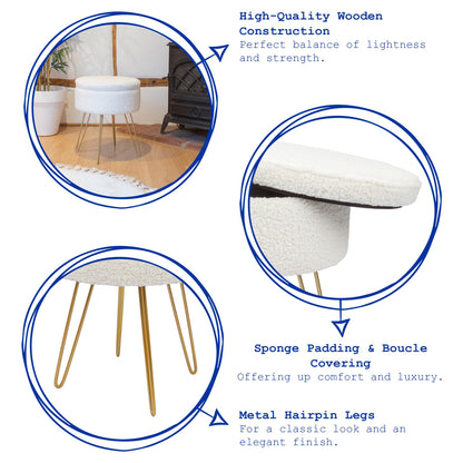 A layer of foam padding neatly encompasses the stools, ensuring lasting comfort, whilst the soft boucle covering creates the ultimate level of luxury. The metal hairpin legs, meanwhile, protect surfaces from scuffs and scratches whilst further accentuating the stool's elegant, stylish aesthetic.