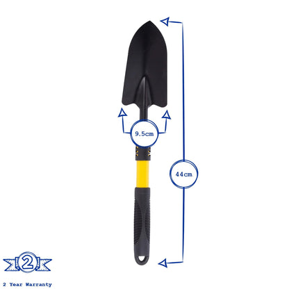 This durable trowel is manufactured with a carbon steel head which has a black powder-coated finish & soft cushion grip handle with a hanging hole.