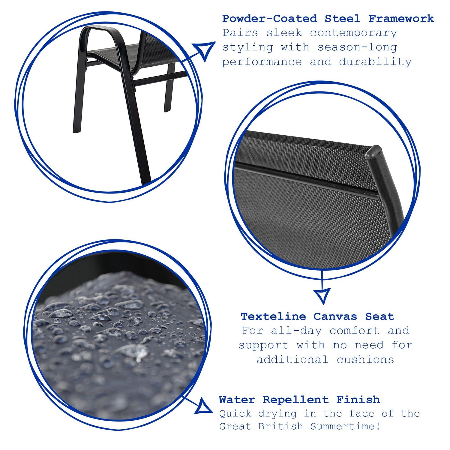 The powder-coated metal framework of this 2-piece combination offers season-long strength, support and stability while keeping everything light enough to move and manoeuvre with the minimum of fuss. Each chair comes fitted with a reinforced texteline bed that keeps you sitting comfortably without the need for additional cushions or support.
