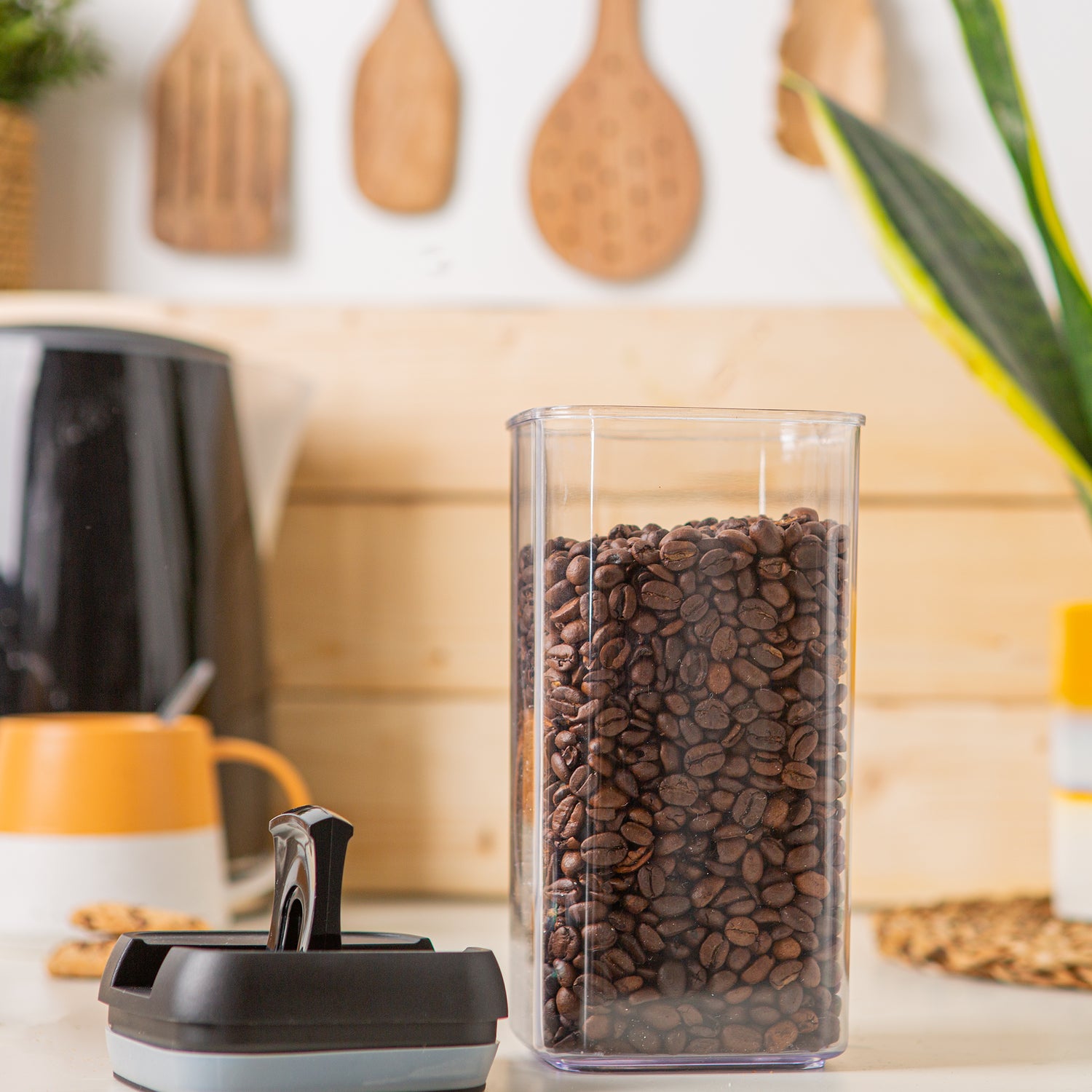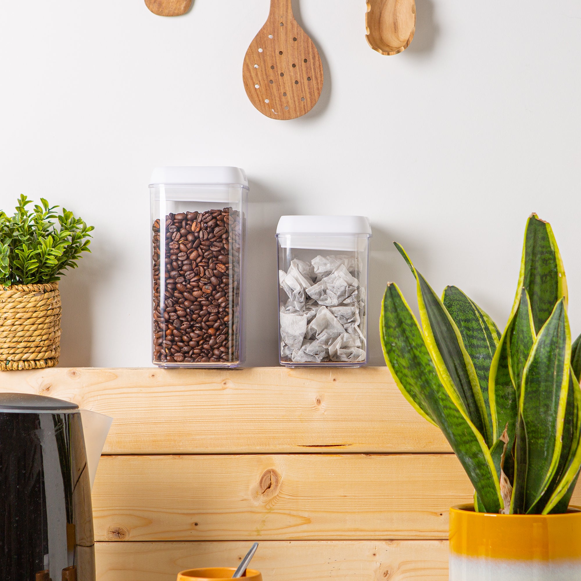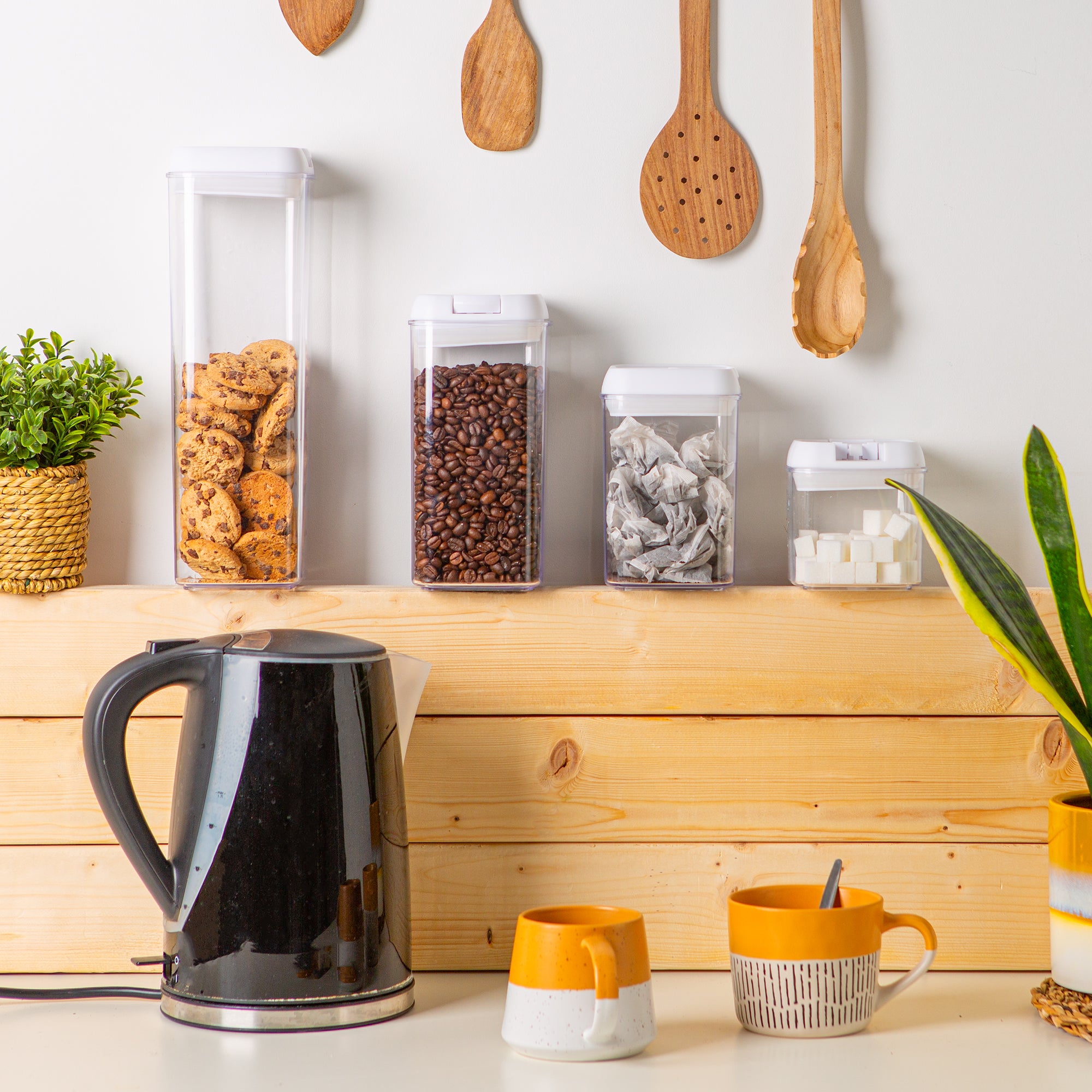 Designed for maximum space efficiency; these stackable canisters can be easily customised to fit any space. Each container is sized perfectly to store everyday household staples including cereal, flour, sugar, pasta, rice, coffee, nuts, snacks, and sweets!