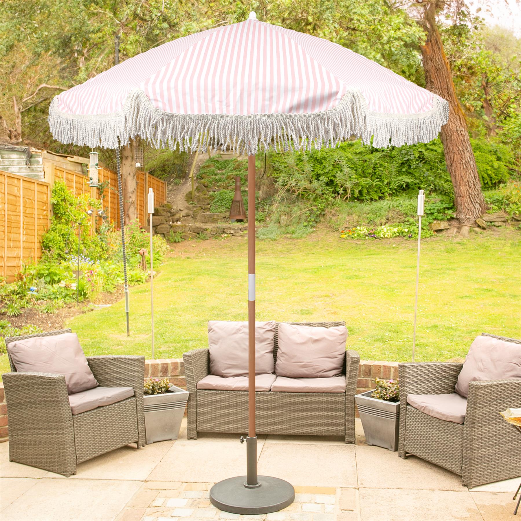 Add a touch of trendy Boho elegance to any outdoor space or al fresco gathering with this Wooden Garden Parasol with Fringe from Harbour Housewares.