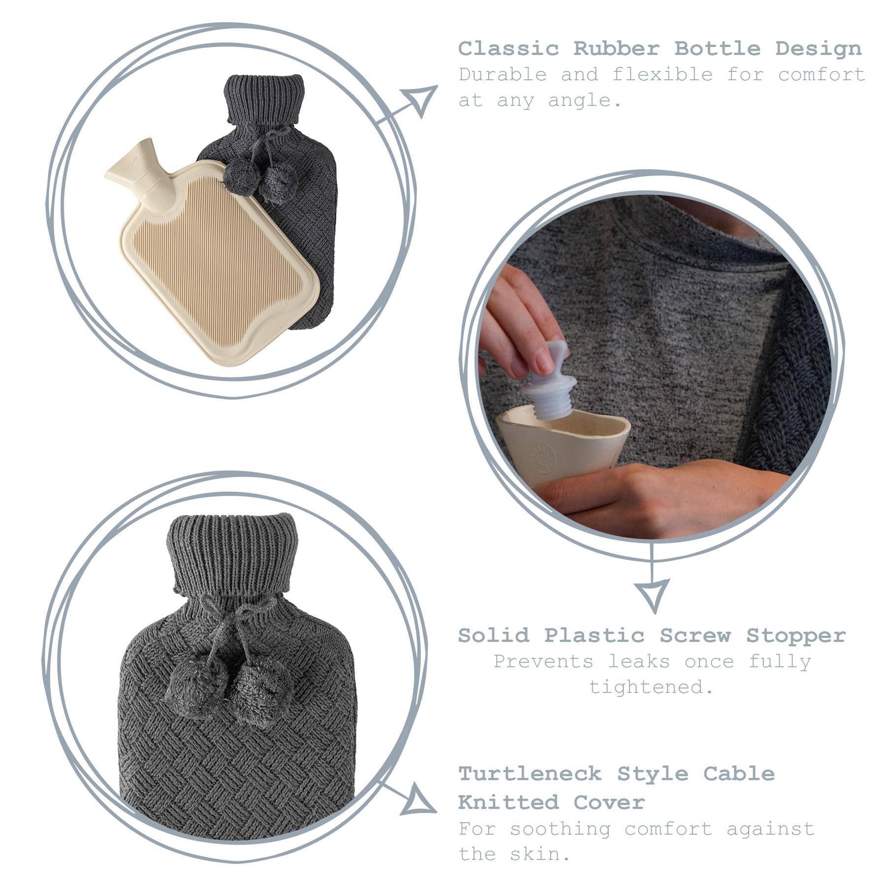 A cute turtleneck-style knitted cover with pom poms sits comfortably against the skin, while filling is made easy thanks to the leakproof solid plastic screw top stopper in the spout.