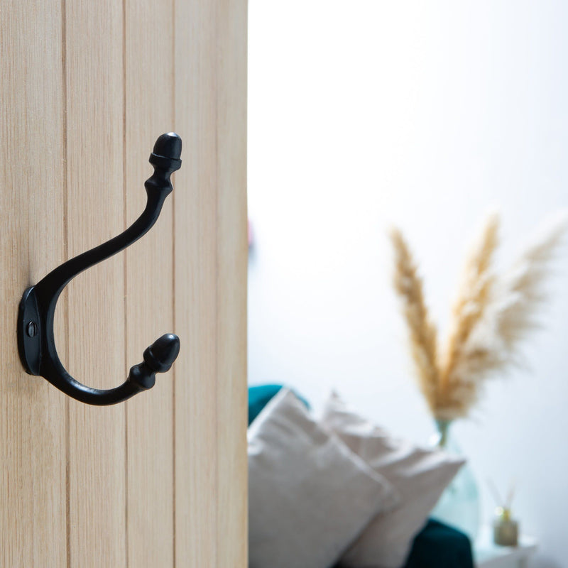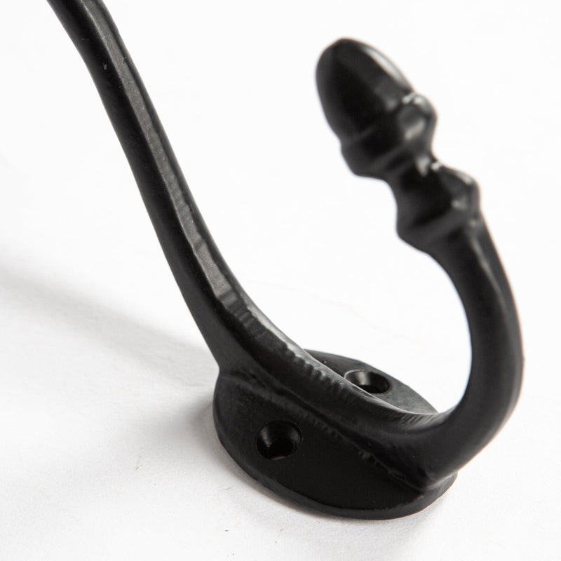 Forged from iron with a classic powder-coated finish, this durable dual-pronged hook provides an efficient space-saving storage solution for coats, cloaks, bathrobes, bags and more.
