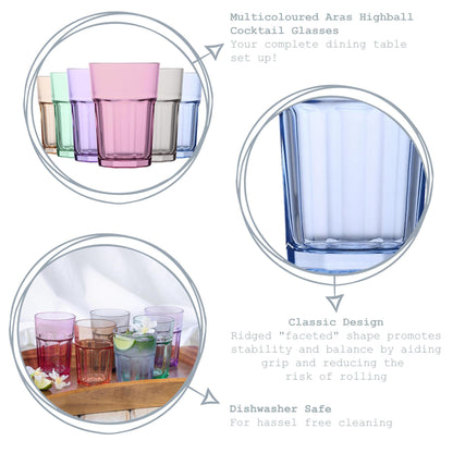 Taking inspiration from classic glassware design, each tumbler in the Aras collection features a ridged multi-faceted shape that promotes stability and balance - secure in the hand and less likely to roll off a surface if knocked over. The generous 365ml capacity creates an ideal vessel for serving a variety of vibrant highball cocktails, while also opening the usage of these glasses up to bottled beers, soft drinks and juices.