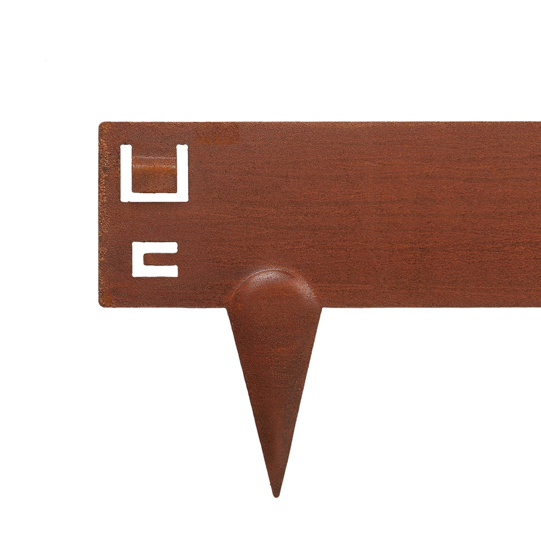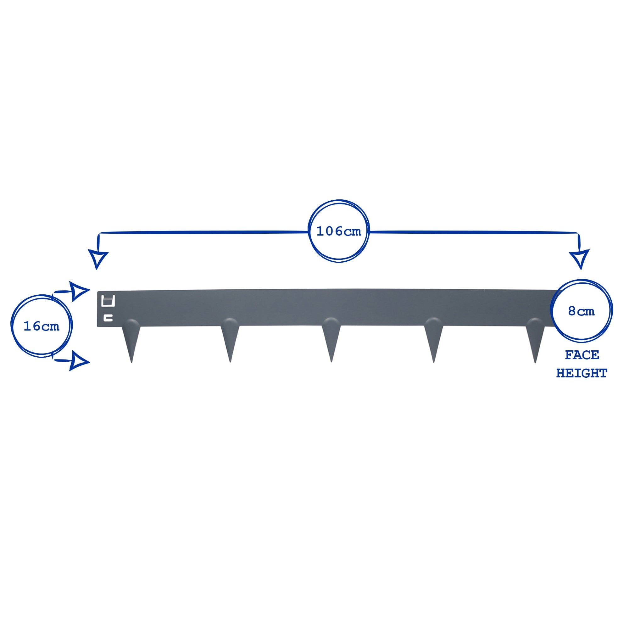 Each border piece features a series of 8cm spikes, moulded from the same single piece of metal and curved to provide maximum strength and stability once tapped into the soil.