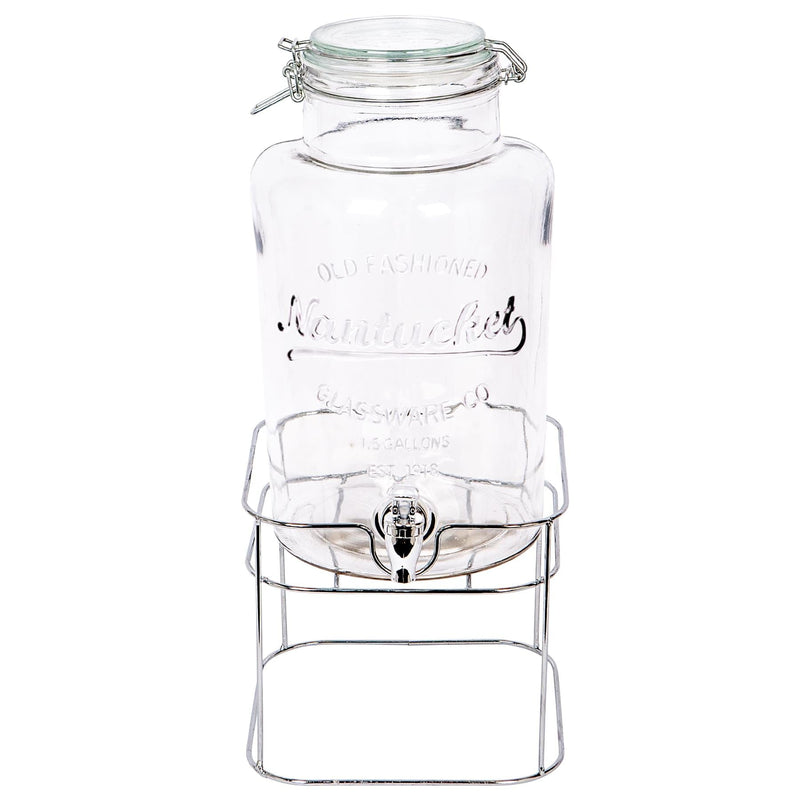 A sleek metal stand allows this dispenser to be set back from the edge of tables or counters for additional safety and security, while the embossed "Old Fashioned Nantucket Glassware" logo provides the perfect retro finishing touch to classic, coastal and industrial interiors alike!
