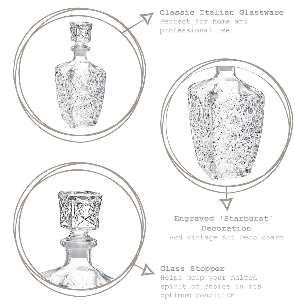 An exercise in engineering excellence, this decanter features an elaborate cut glass decoration that harkens back to the 'roaring' days of Art Deco and the Great Gatsby.