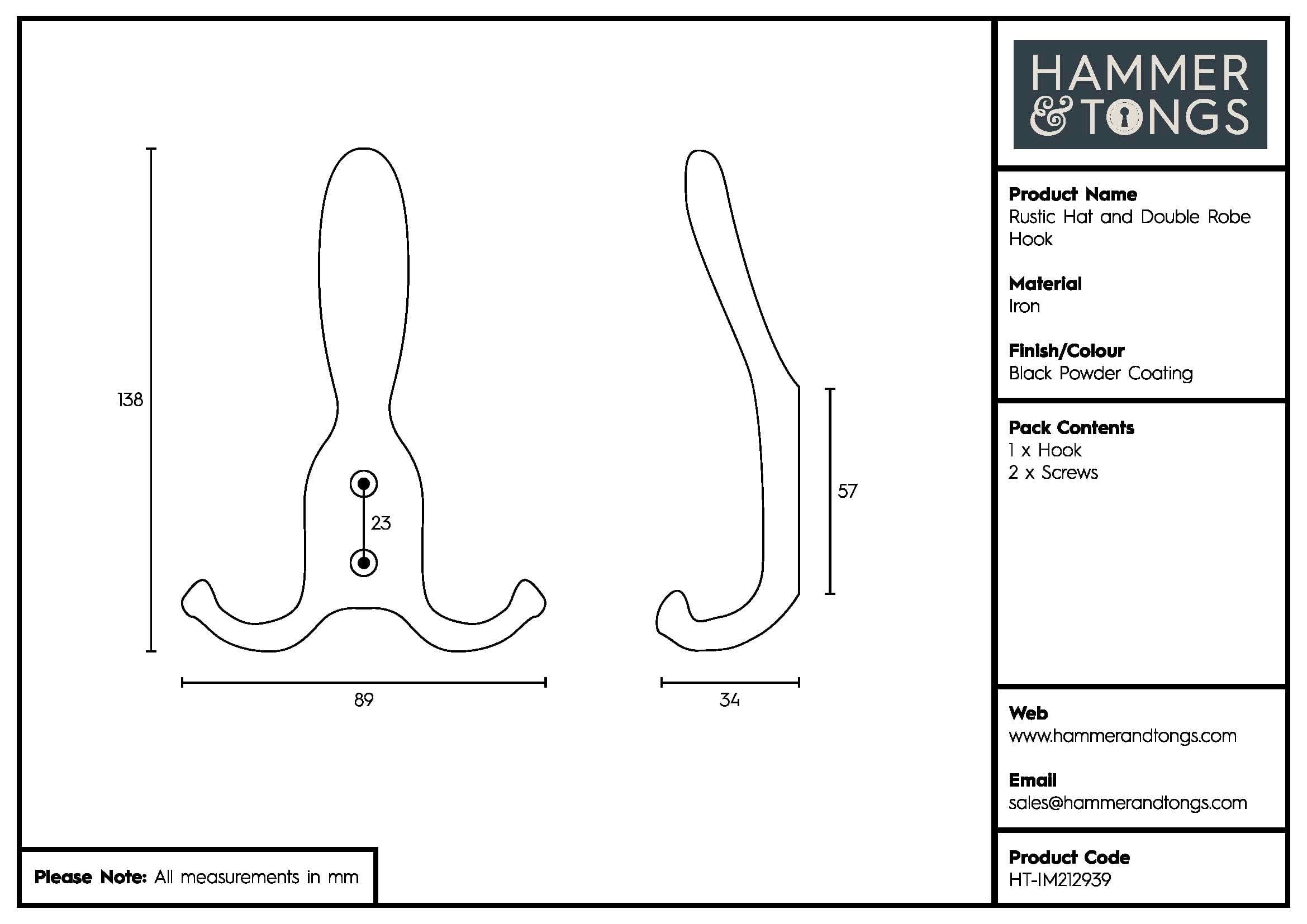 Add an authentic antique finish to any cloakroom, hallway or bedroom door with our Hammer & Tongs Rustic Hat and Double Robe Hook.