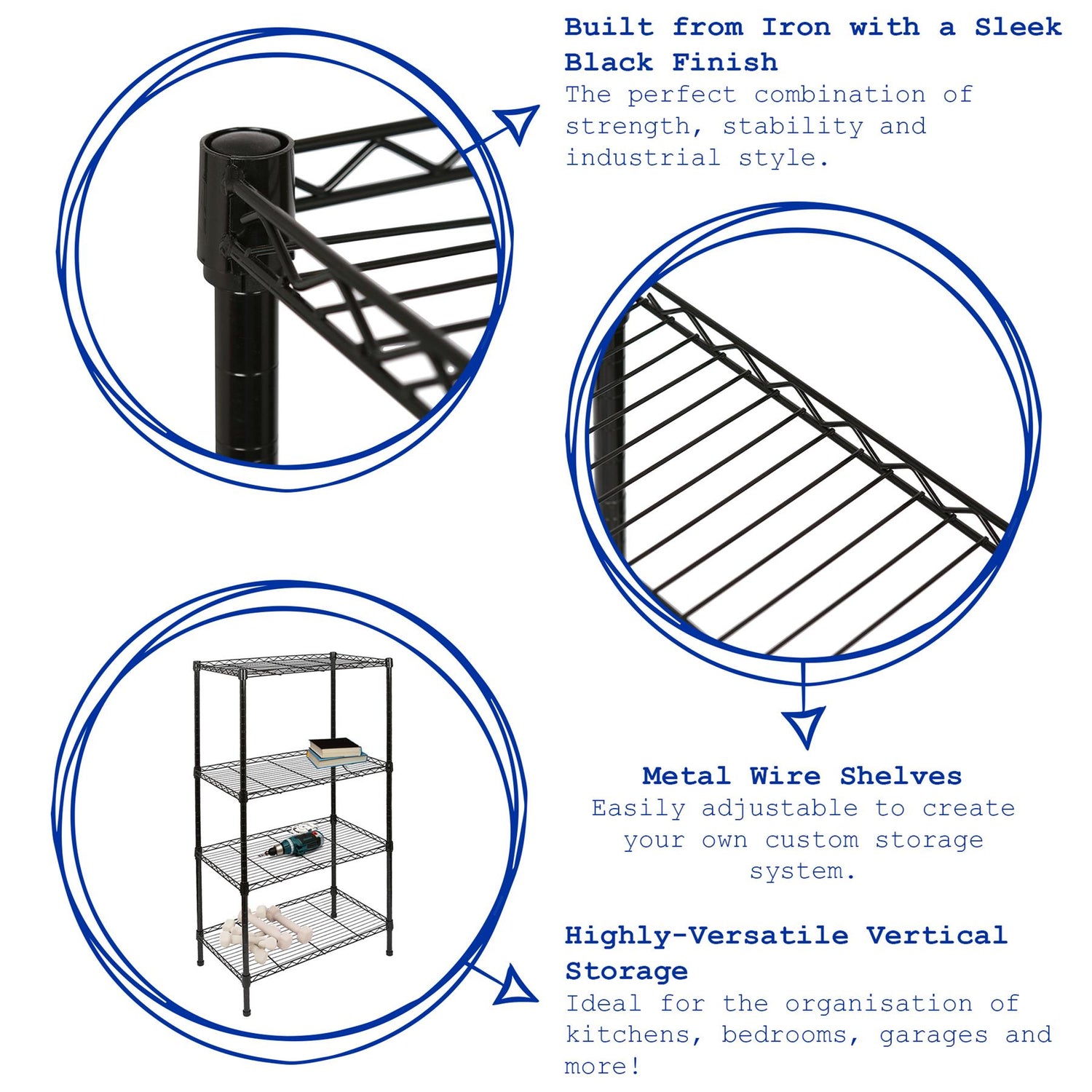 Built from iron with a sleek black finish, the tubular structure of this unit boasts the perfect combination of lightness and strength; easy to assemble and install yet with each wire shelf sturdy enough to support up to 95kg (evenly distributed).