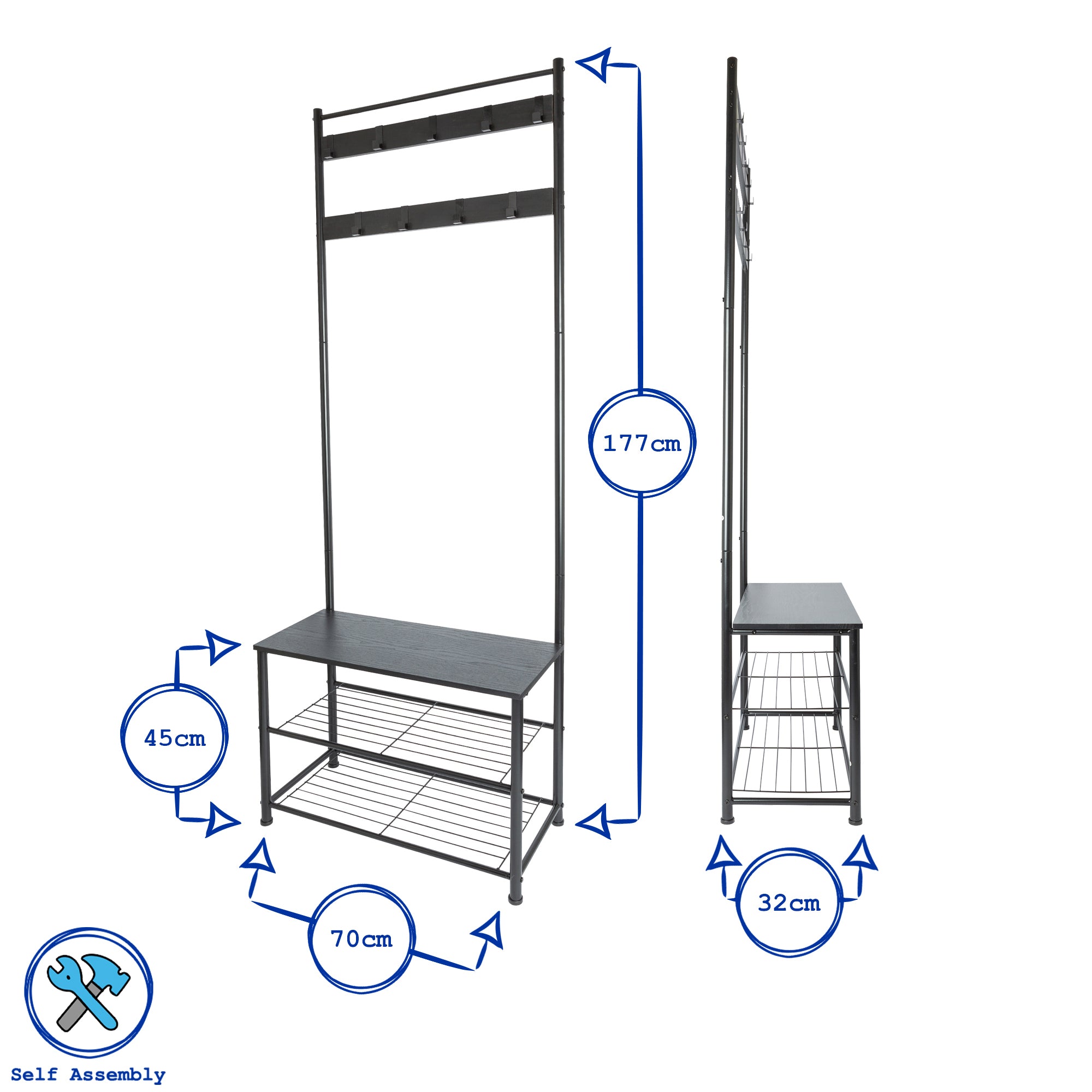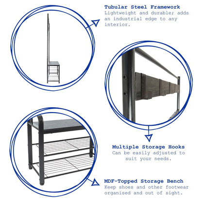 A series of nine sturdy metal hooks offers ample storage options for everybody's coats and jackets, while the MDF-topped storage bench lets you keep shoes and other footwear organised and out of the way.